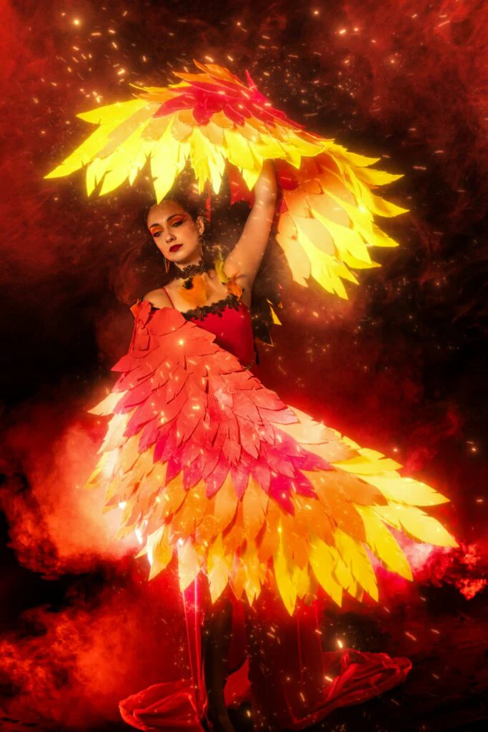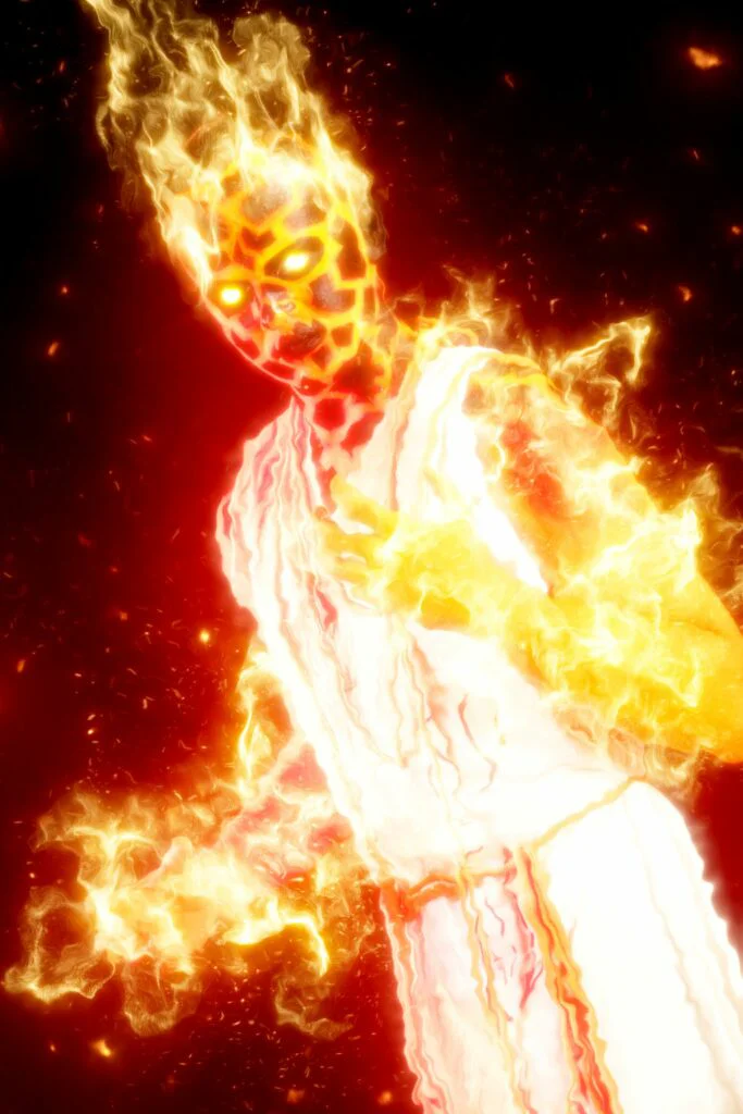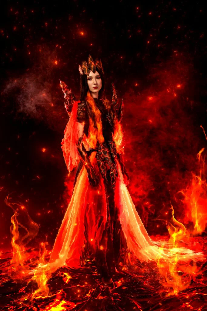 Идея: вселенная огненных сущностей, каждая из которых — отдельный персонаж с авторской историей, костюмом и визуальным стилем. Метеор, Феникс, Лава, Дым, Хранитель блуждающих огоньков, Жар, Элементаль, Кипящая кровь, Блум — одиннадцать образов, каждый с собственной легендой и предысторией.