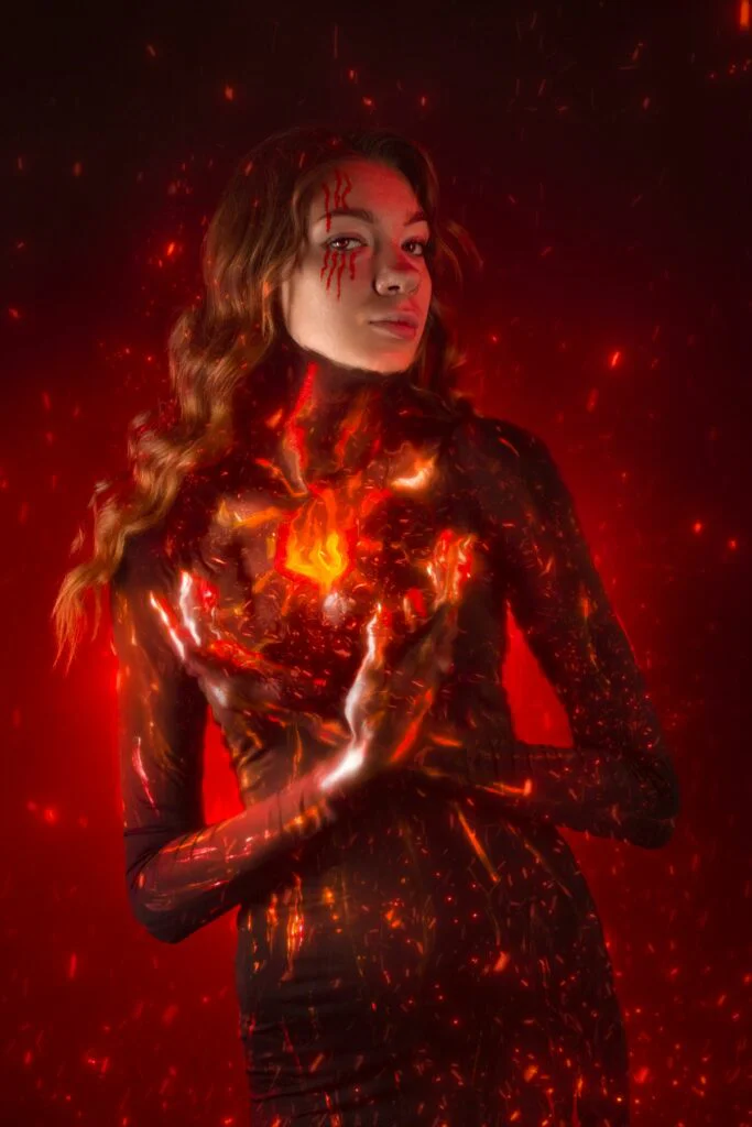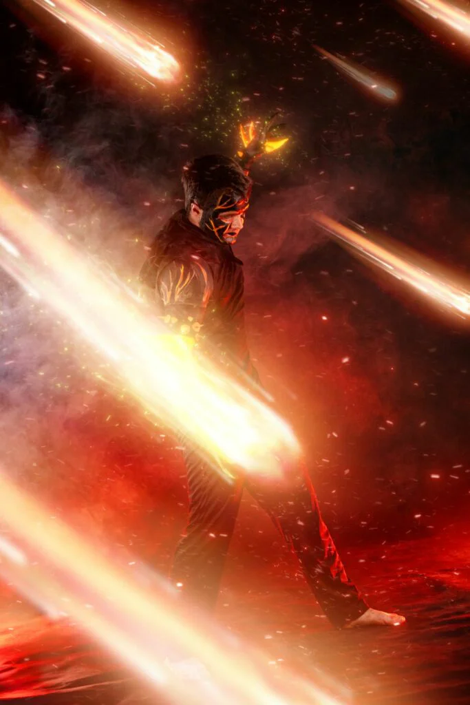Для большинства фотографов обработка — это цветокоррекция, ретушь кожи, может быть, замена фона. Для V.ART обработка — это половина творческого процесса. VFX-эффекты (Visual Effects) — огонь, магические потоки, свечение, частицы, дым — дорисовываются вручную поверх фотографии, превращая студийный кадр в кинематографичную сцену.