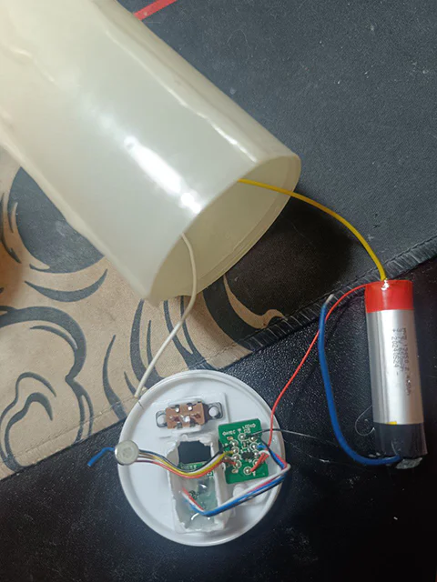Просверлите или прорежьте небольшое отверстие в дне свечи для USB-C разъёма. Зафиксируйте плату горячим клеем. Теперь свечу можно заряжать, не разбирая.